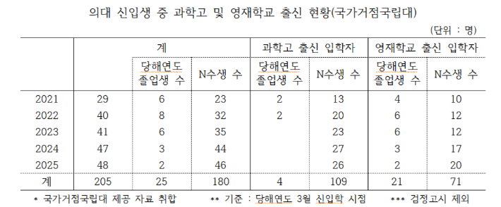과학고·영재학교 나와 거점국립대 의대로 5년간 205명…n수생 88%