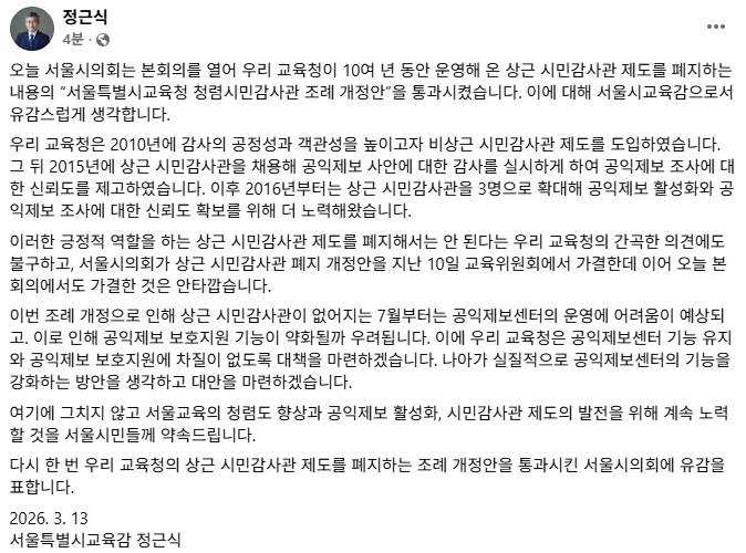 • 머니투데이정근식 "상근 시민감사관제 폐지, 시의회 통과…감사 기능 약화 우려"