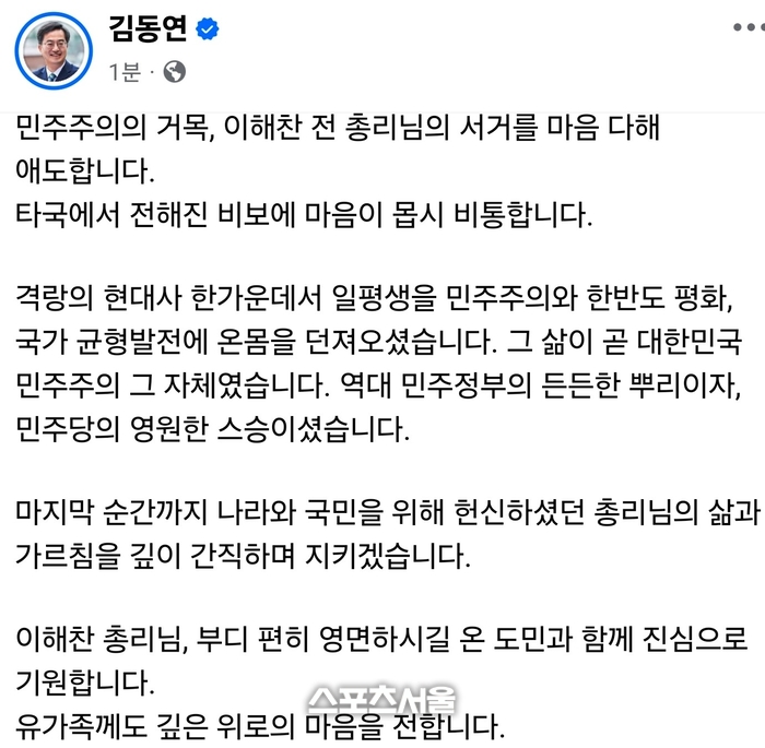 • 스포츠서울김동연“타국서 전해진 비보 마음이 몹시 비통하다”
