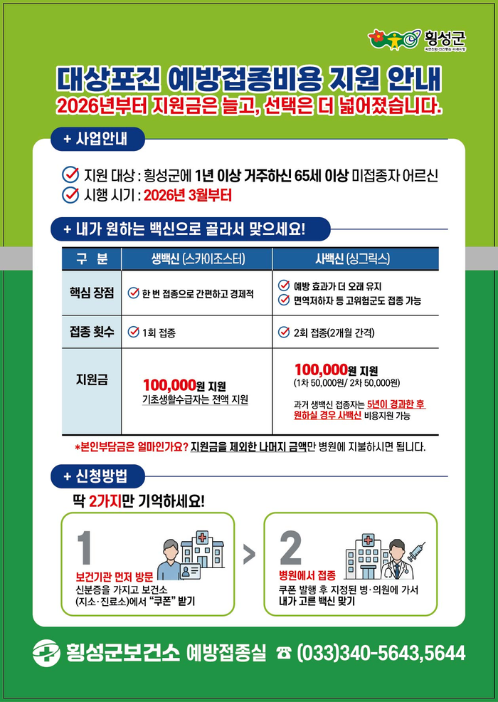횡성군, 대상포진 접종 지원 확대… ‘생·사백신’ 선택 가능해진다