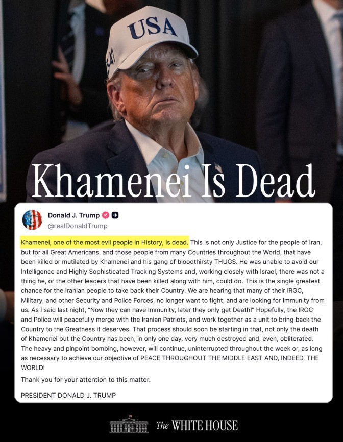트럼프 "하메네이 사망…이란 국민, 나라 되찾을 위대한 기회"