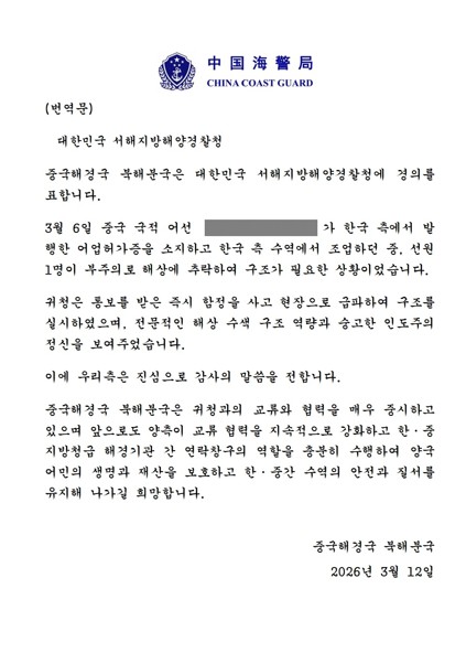 • 연합뉴스"선원 수색에 감사"…중국, 해경에 서한문 보내