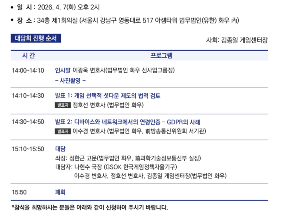 • 서울경제화우, 게임산업 ‘선택적 셧다운 제도’ 간담회 개최